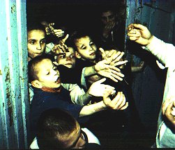 Throughout the story, the children and orphanage staff sat in amazement as they listened. Some sat on the edges of their stools, trying to grasp every word. Completing the story, we gave the children three small pieces of cardboard to make a crude manger. Each child was given a small paper square, cut from yellow napkins I had brought with me. No colored paper was available in the city.