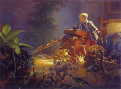 (This Page Graphic Intense Please Wait For Loading)Painting "Bon Voyage" ©Copyright Greg Olsen Gallery used with permission God Lives Under The Bed!My brother Kevin thinks God lives under his bed. At least that's what I heard him say one night. He was praying out loud in his dark bedroom, and I stopped outside his closed door to listen. Are you there, God?" he said. Where are you? Oh, I see. Under the bed." I giggled softly and tiptoed off to my own room.Kevin's unique perspectives are often a source of amusement. But that night something else lingered long after the humor. I realized for the first time the very different world Kevin lives in. He was born 30 years ago, mentally disabled as a result of difficulties during labor. Apart from his size (he's 6-foot-2), there are few ways in which he is an adult. He reasons and communicates with the capabilities of a 7-year-old, and he always will.He will probably always believe that God lives under his bed, that Santa Claus is the one who fills the space under our tree every Christmas, and that airplanes stay up in the sky because angels carry them. I remember wondering if Kevin realizes he is different. Is he ever dissatisfied with his monotonous life? Up before dawn each day, off to work at a workshop for the disabled, home to walk our cocker spaniel, returning to eat his favorite macaroni-and-cheese for dinner, and later to bed.The only variation in the entire scheme are laundry days, when he hovers excitedly over the washing machine like a mother with her newborn child. He does not seem dissatisfied. He lopes out to the bus every morning at 7:05, eager for a day of simple work. He wrings his hands excitedly while the water boils on the stove before dinner, and he stays up late twice a week to gather our dirty laundry for his next day's laundry chores. And Saturdays - oh, the bliss of Saturdays! That's the day my dad takes Kevin to the airport to have a soft drink, watch the planes land, and speculate loudly on the destination of each passenger inside. "That one's going' to Chi-car-go!" Kevin shouts as he claps his hands. His anticipation is so great he can hardly sleep on Friday nights. I don't think Kevin knows anything exists outside his world of daily rituals and weekend field trips. He doesn't know what it means to be discontent. His life is simple. He will never know the entanglements of wealth of power, and he does not care what brand of clothing he wears or what kind of food he eats. He recognizes no differences in people, treating each person as an equal and a friend. His needs have always been met, and he never worries that one day they may not be. His hands are diligent. Kevin is never so happy as when he is working. When he unloads the dishwasher or vacuums the carpet, his heart is completely in it. He does not shrink from a job when it is begun, and he does not leave a job until it is finished. But when his tasks are done, Kevin knows how to relax. He is not obsessed with his work or the work of others. His heart is pure. He still believes everyone tells the truth, promises must be kept, and when you are wrong, you apologize instead of argue. Free from pride and unconcerned with appearances, Kevin is not afraid to cry when he is hurt, angry or sorry. He is always transparent, always sincere.And he trusts God. Not confined by intellectual reasoning, when he comes to Christ, he comes as a child. Kevin seems to know God-to really be friends with Him in a way that is difficult for an "educated" person to grasp. God seems like his closest companion. In my moments of doubt and frustrations with my Christianity, I envy the security Kevin has in his simple faith. It is then that I am most willing to admit that he has some divine knowledge that rises above my mortal questions. It is then I realize that perhaps he is not the one with the handicap......I am.My obligations, my fear, my pride, my circumstances - they all become disabilities when I do not submit them to Christ. Who knows if Kevin comprehends the things I can never learn? After all, he has spent his whole life in that kind of innocence, praying after dark and soaking up the goodness and love of the Lord.And one day, when the mysteries of heaven are opened, and we are all amazed at how close God really is to our hearts, I'll realize that God heard the simple prayers of a boy who believed that God lived under his bed.Kevin won't be surprised at all.FRIENDS ARE ANGELS WHO LIFT US TO OUR FEET WHEN OUR WINGS HAVE TROUBLE REMEMBERING HOW TO FLY.~ ~If this inspirational message touched your heart please click on the gray bar below to share it with your friends! NEXT BACK HOME Greg Olsen Artistry Gallery © 2001 Dave ~ The PalletMaster"There is no cure for birth and death save to enjoy the interval."